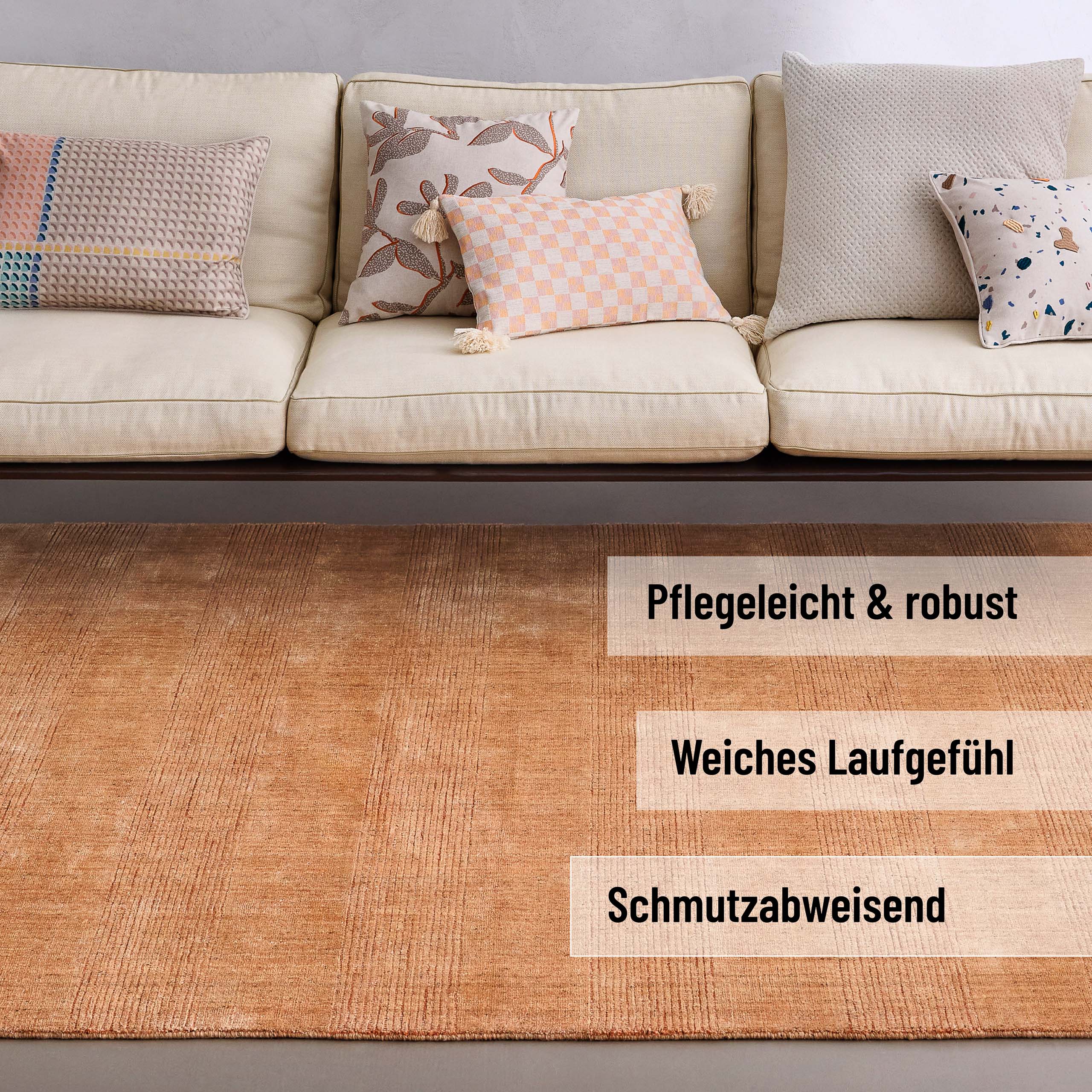 - • Jeder Teppich wird einzeln geprüft, maschinell oder handgefertigt. Kleine Abweichungen in Farbe oder Maß zeigen: Kein Produkt von der Stange